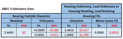 Для приведенных выше условий в Таблице 2 показано, что спецификации корпуса требуют слегка ослабленной посадки наружного диаметра подшипника с корпусом. В этом случае наибольший наружный диаметр подшипника и наименьшее отверстие в корпусе создадут прямую посадку.